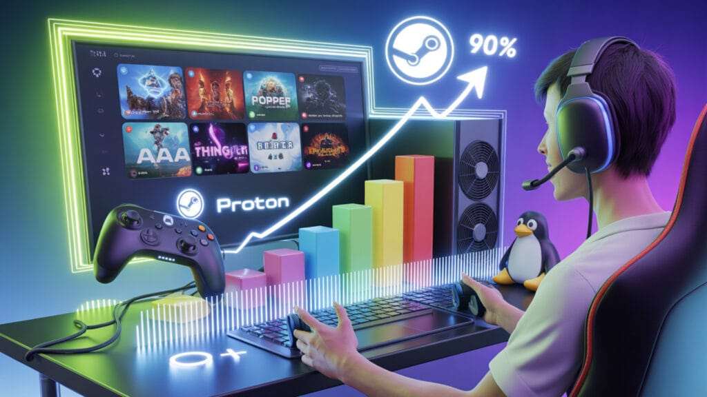 El estado del gaming en Linux es simplemente excepcional en 2026. Proton, la capa de compatibilidad de Valve, alcanza ahora un impresionante 90% de compatibilidad con juegos de Steam. Este porcentaje era impensable hace apenas unos años.